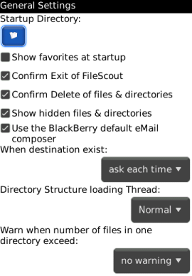 You can either manually type the path of your startup directory or you move the cursor into the text input field and press the #Menu Button of your device and select the menu item: . Now you can browse over your device filesystem (only directories will be displayed)and go to your wanted startup directory. Please note, you have to go into the directory you would like to have as startup directory. Once you have reached the directory of your choice select from the menu the item . This will close the directory browser and brings you back to the options dialog with the selected directory path in the 'Startup Directory' text input field.