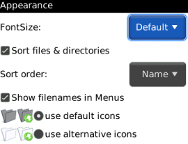 The BlackBerry® file system allows to mark files and directories as hidden. This checkbox allows you to specify if you want to see hidden files and directories within FileScout or not. By default this option is checked.