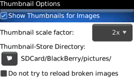 You can either manually type the path of your thumbnail store directory or you move the cursor into the text input field and press the #Menu Button of your device and select the menu item: . Now you can browse over your device filesystem (only directories will be displayed) and go to your wanted thumbnail store directory. Please note, you have to go into the directory you would like to have as thumbnail store directory. Once you have reached the directory of your choice select from the menu the item . This will close the directory browser and brings you back to the options dialog with the selected directory path in the 'Thumbnail-Store Directory' text input field.