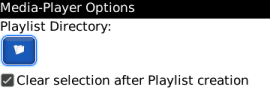 You can either manually type the path of your playlist directory or you move the cursor into the text input field and press the #Menu Button of your device and select the menu item: . Now you can browse over your device filesystem (only directories will be displayed) and go to your wanted playlist directory. Please note, you have to go into the directory you would like to have as playlist directory. Once you have reached the directory of your choice select from the menu the item . This will close the directory browser and brings you back to the options dialog with the selected directory path in the 'Playlist Directory' text input field.