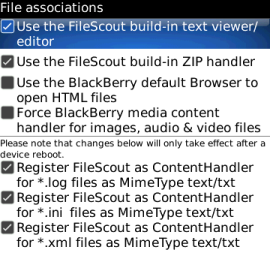 Use the FileScout build-in ZIP handler (default ON) "". In previous versions of FileScout HTML files where always opened with the Media application. With .Checkbox 'Use the BlackBerry default Browser to open HTML files'