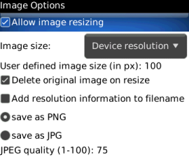 You can select, if the resized images will be stored as PNG (default) or as JPG, once you select the JPG format you can additionally specify the quality (1=low | 100=best)