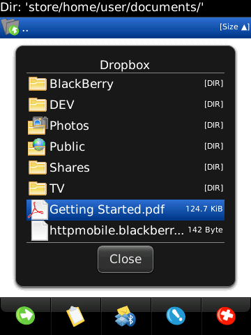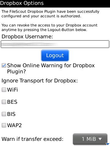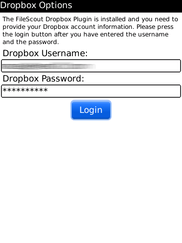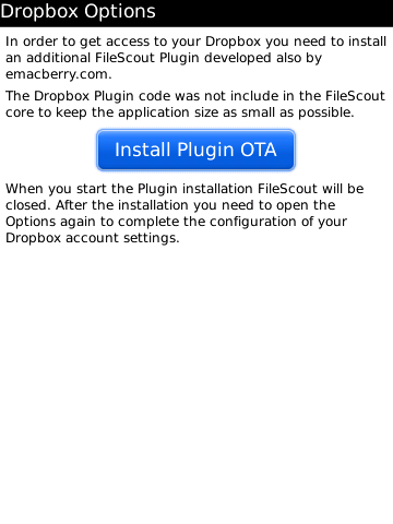 You need a FileScout RegistrationCode in order to connect to your Dropbox account. The Plugin will not work for the free FileScout Lite Version. There is no need to have anything additionally installed on your BlackBerry®.